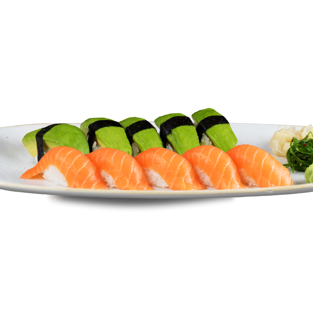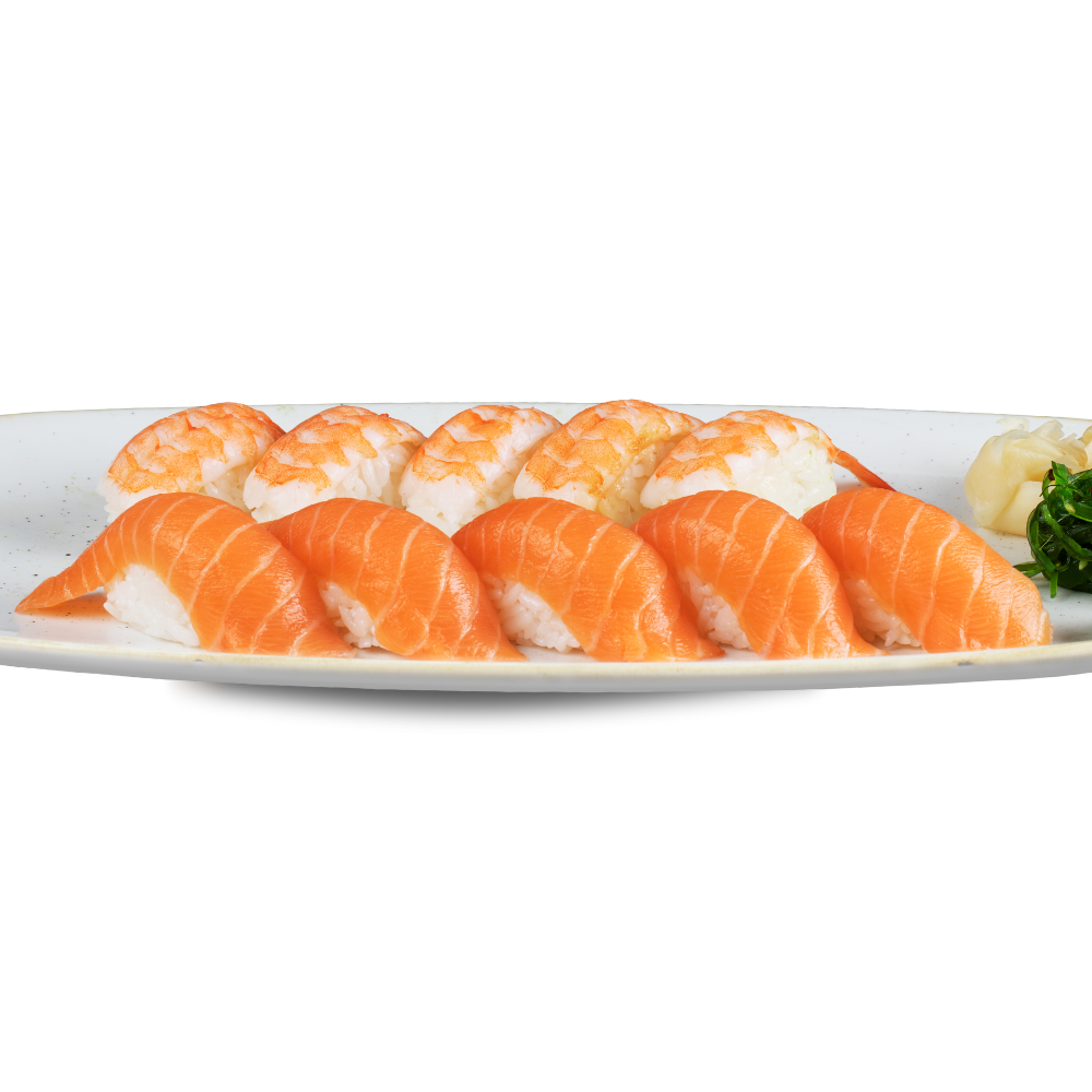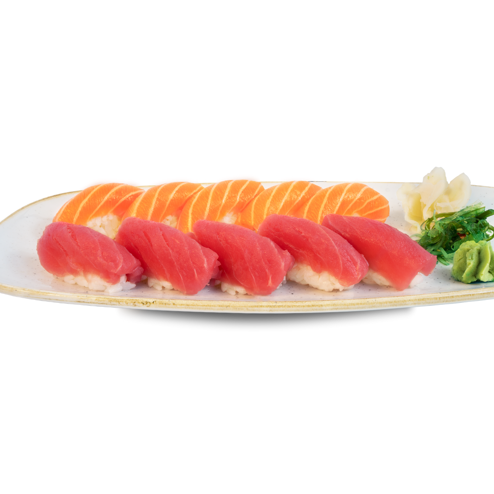 5 lax och 5 halstrad lax nigiri. De halstrade bitarna toppas med söt sojasås, gochujangmajonnäs, vårlök och sesamfrön.