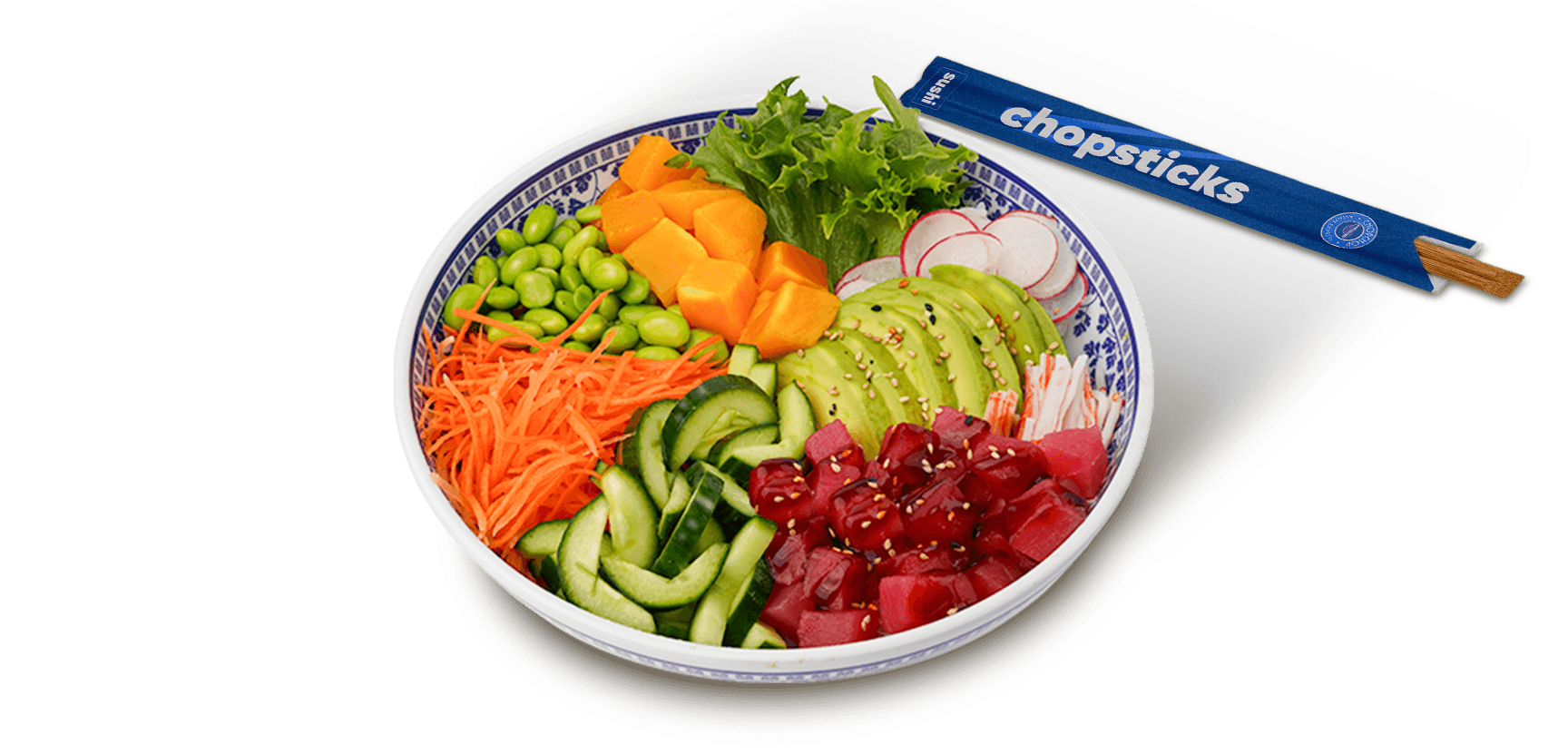 Marinerad tonfisk, avokado, mango, sallad, sojabönor och surimi på sushiris. Serveras med chilimajonnäs.