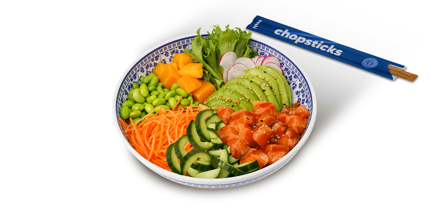 En exotisk bowl inspirerad av Hawaiian Street Food. Här förenas marinerad lax och fruktig mango med avokado, sojabönor, sallad, gurka och strimlad morot, på en bädd av sushiris.